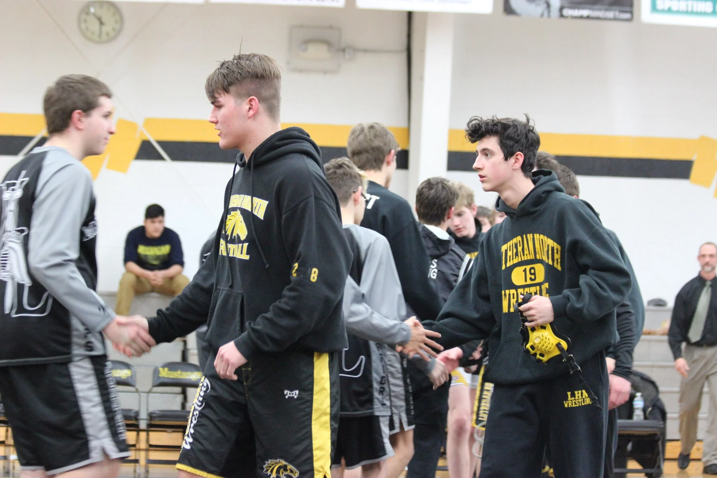 Coach Tuomi invited all fans, players, and coaches to the mat to pray after the LHN, LHNW, and LHWL wrestling mat. The prayer was lead by Rev. Dr. Evan Gaertner who wrestled for Lutheran North and whose son now wrestles for Lutheran Northwest.
